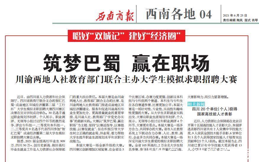 (来源:西南商报,2021年6月25日,第04期:筑梦西南,巴蜀赢在职场,川渝两地人力资源和社会教育部门联合发起模拟求职和大学生招聘竞赛)